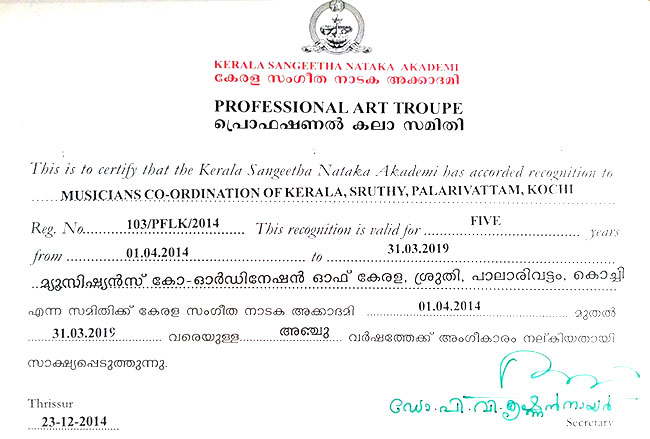 We are affiliated to Kerala Sangeetha Nataka Akademy. This affiliation is valid for five years from 01-April-2014 to 31.Mar-2019. Register number 103/PFLK/2014.