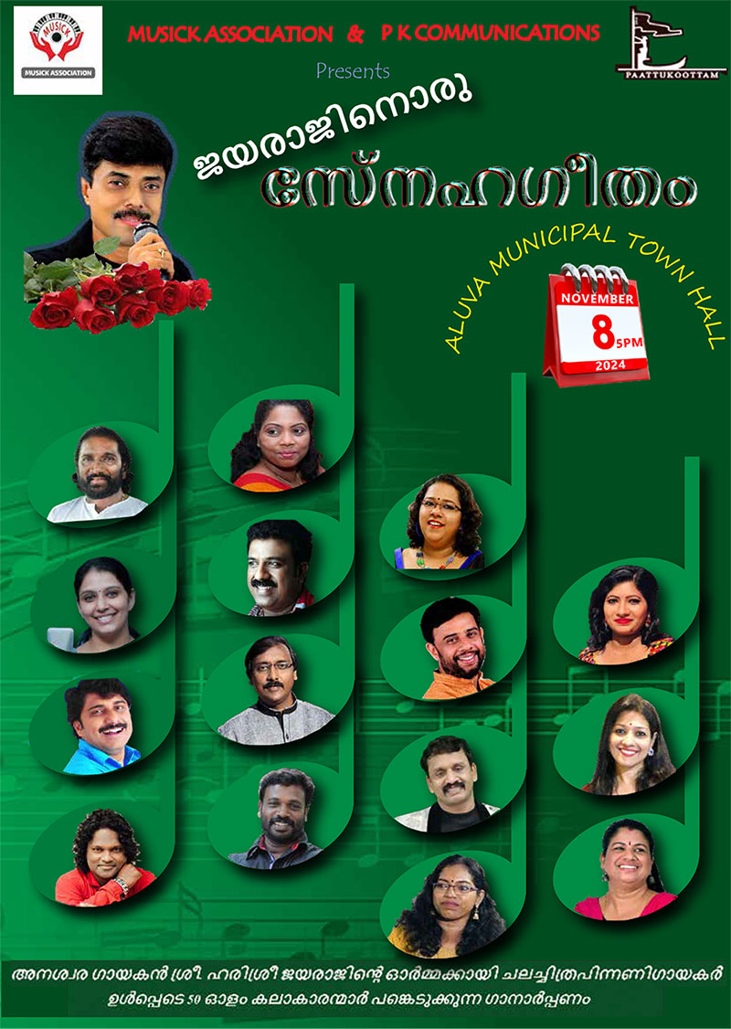 A musical programme conducted for the rememberence of HARISREE JAYARAJ which held on Friday, 08 Nov 2024, 05:00 PM at Municipal Town Hall, Aluva [Read more...]